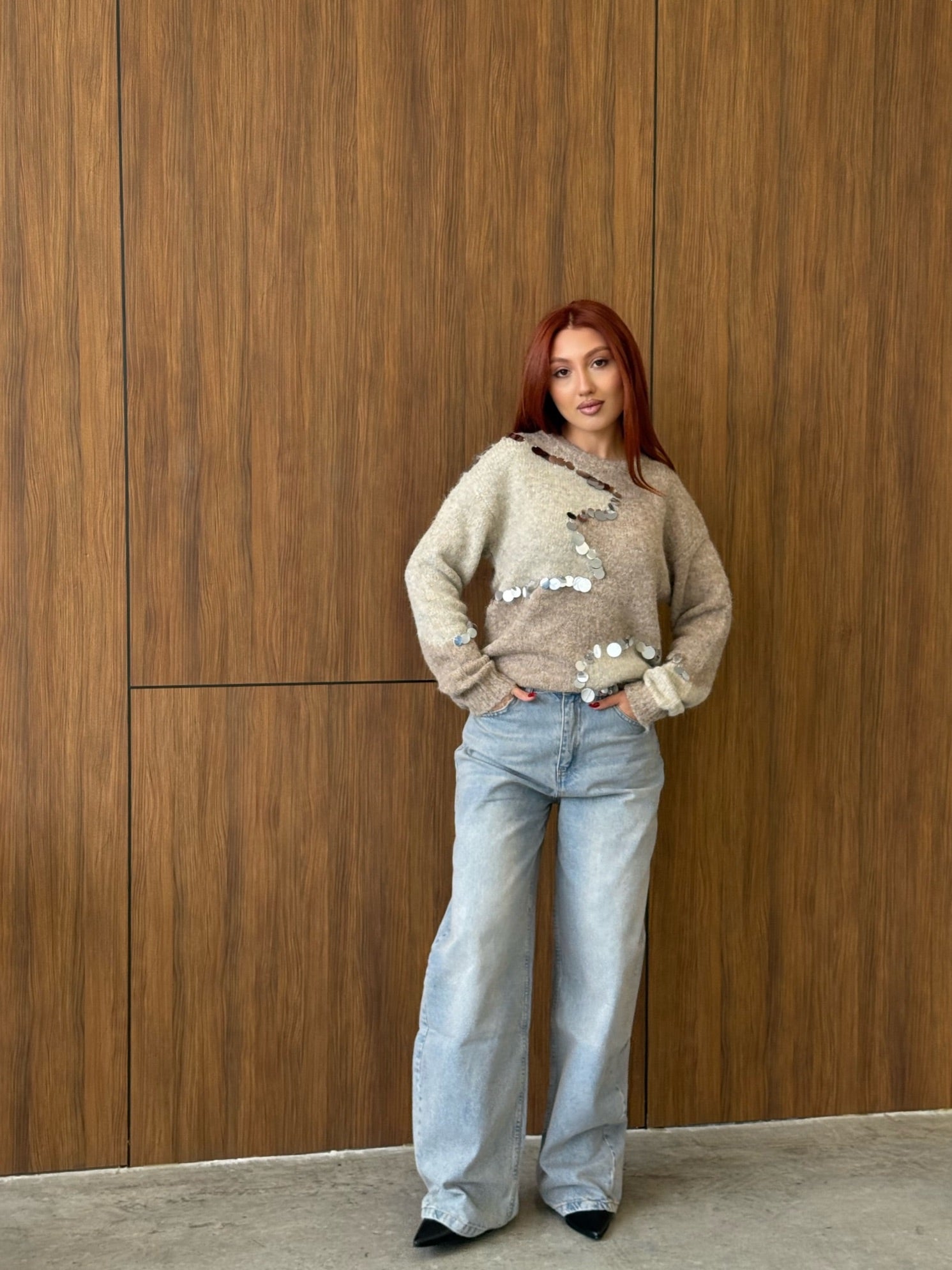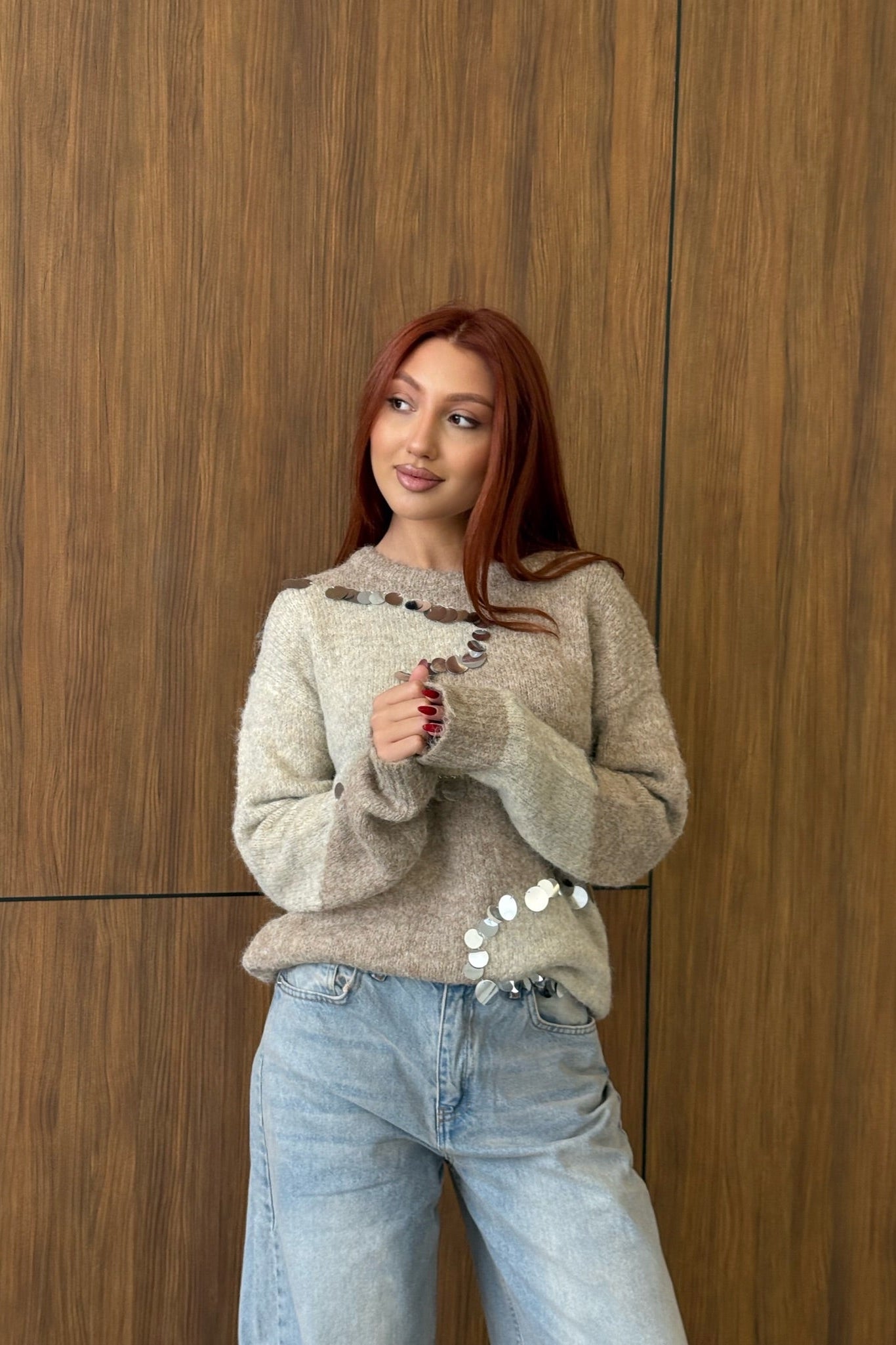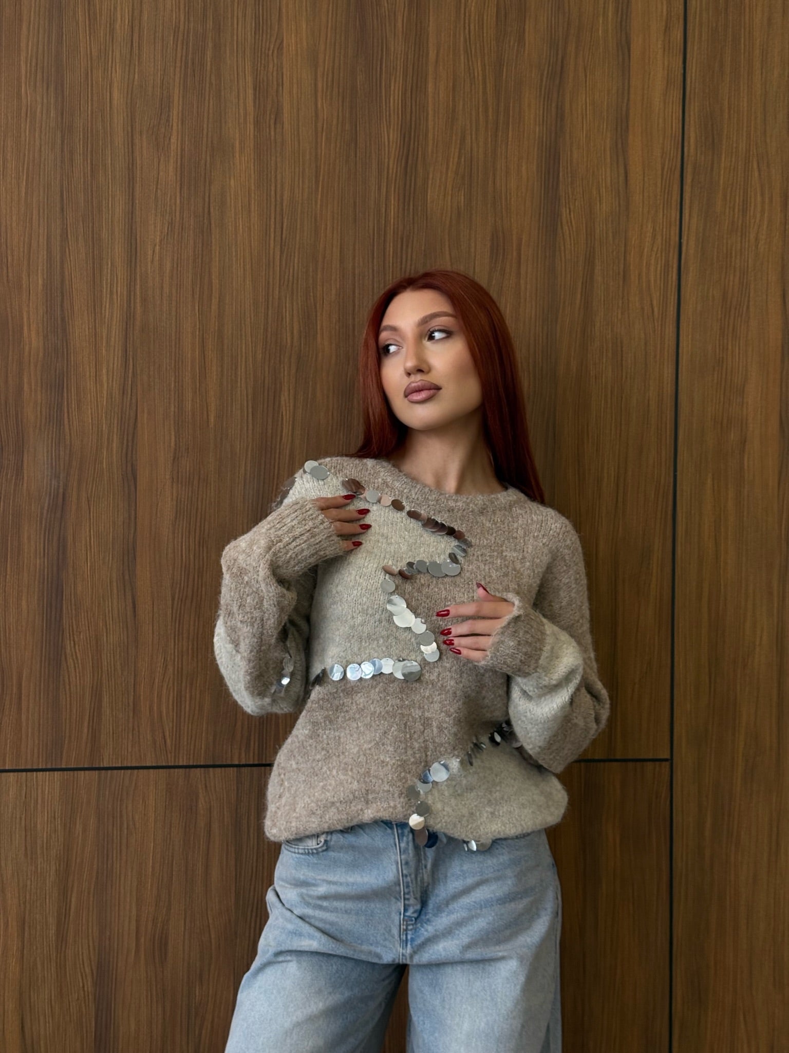 Beige & Cream Contrast Knit with Mirror Sequins