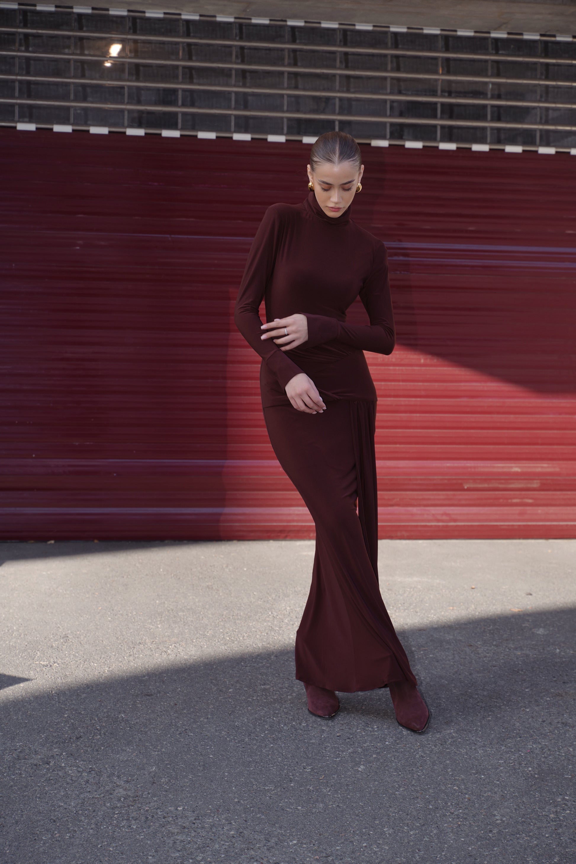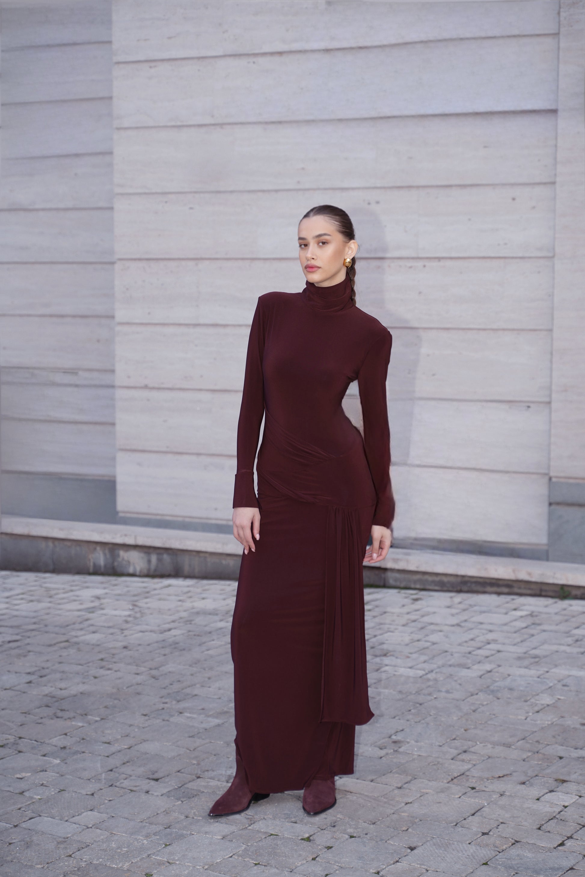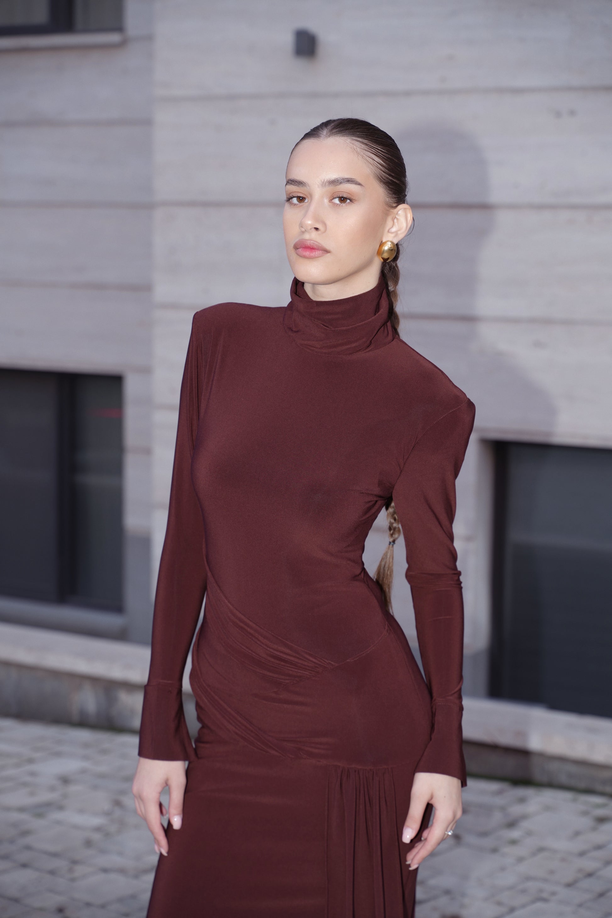 Refined, sculptural, and effortlessly elegant — our Chocolate Draped Turtleneck Maxi Dress is a striking expression of modern minimalism.