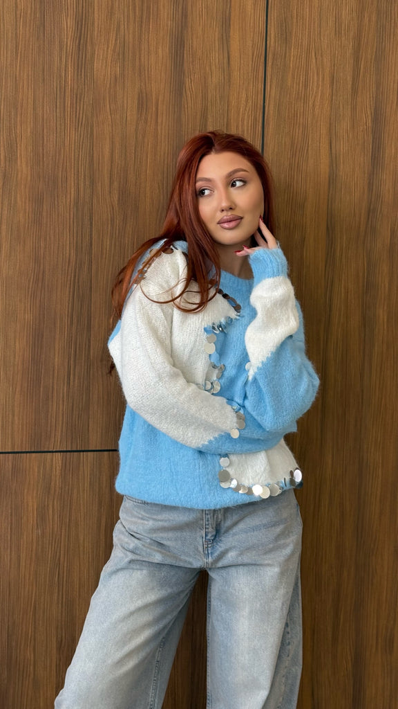 sky blue & White Contrast Knit with Mirror Sequins