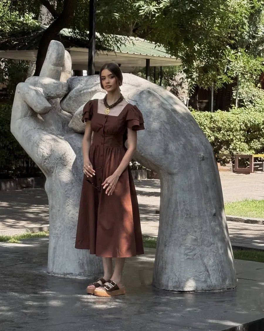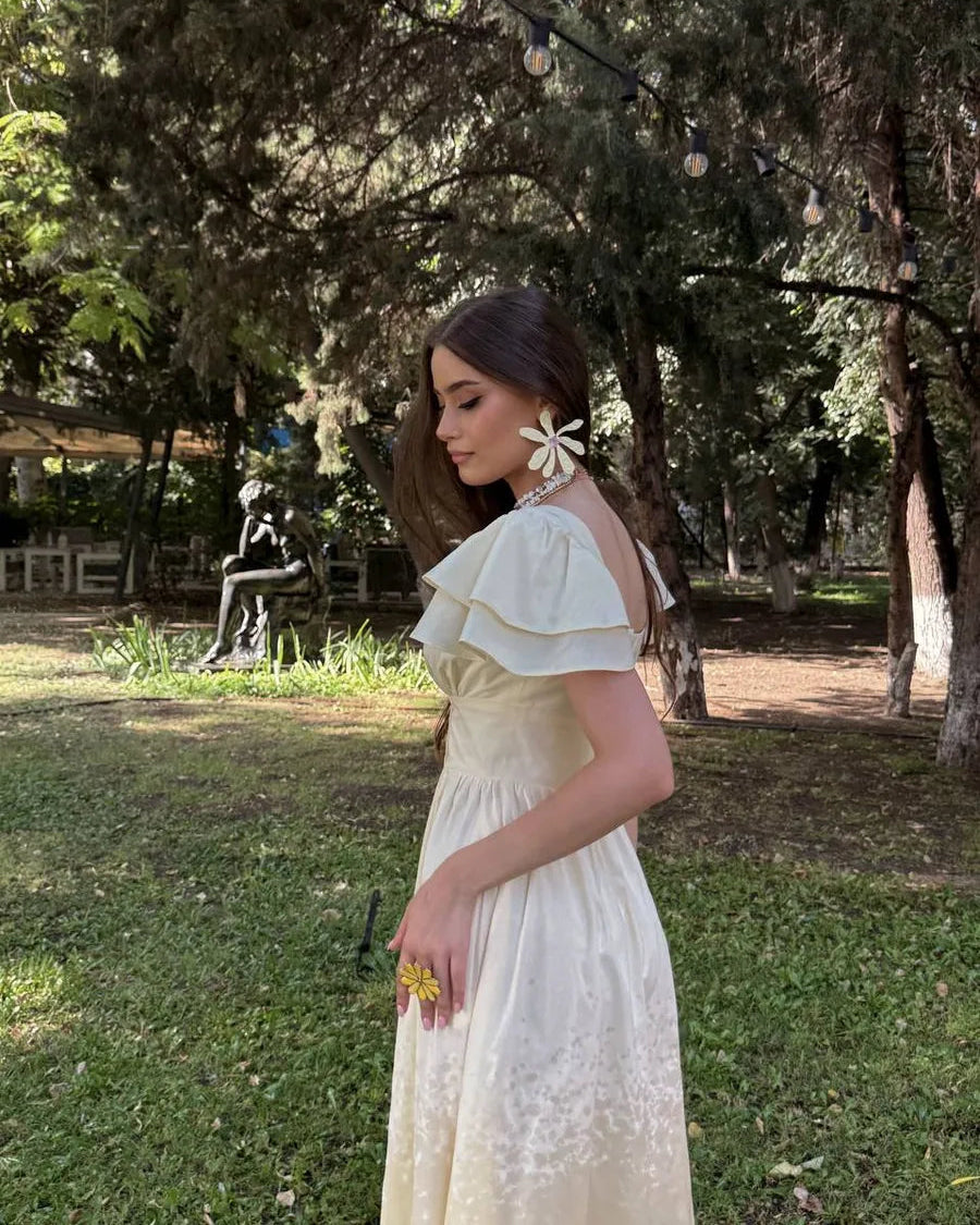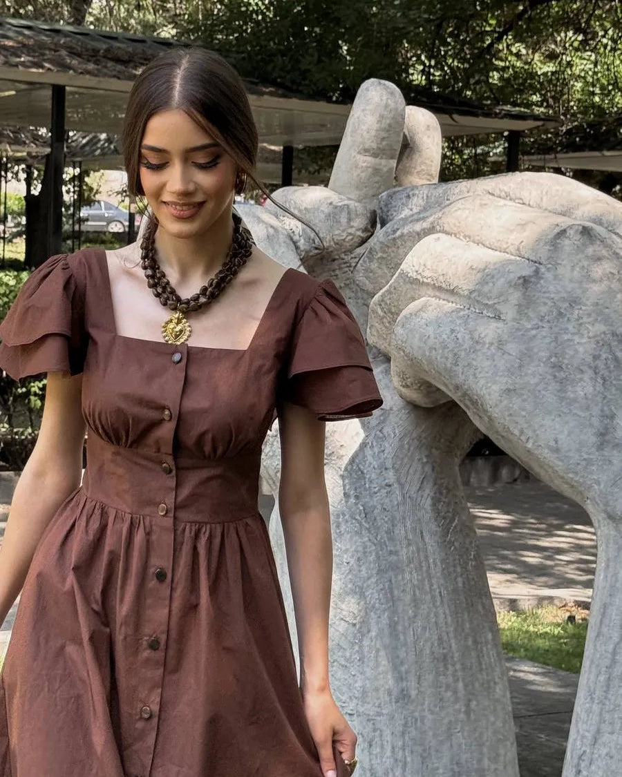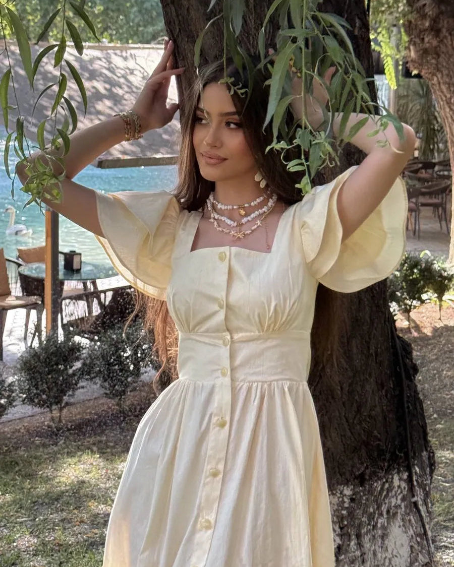 Featuring a structured square neckline and soft layered flutter sleeves, this dress beautifully frames the shoulders and neckline. The fitted waist enhances your shape, while the flowing midi skirt creates graceful movement with every step.