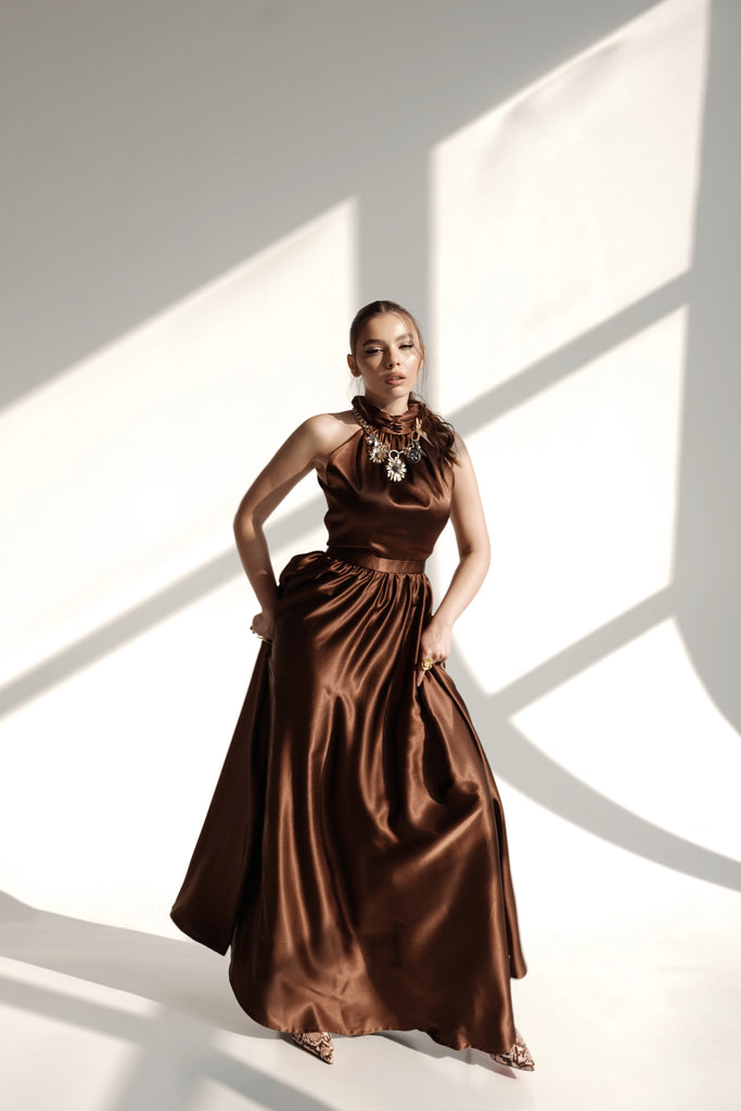 Step into timeless evening elegance with our High-Neck Satin Gown in Deep Chocolate — a dress designed to make an entrance. The luxurious satin catches the light with every movement, creating a soft, fluid glow that enhances the rich chocolate tone.