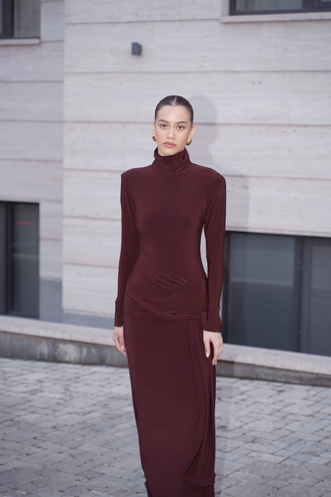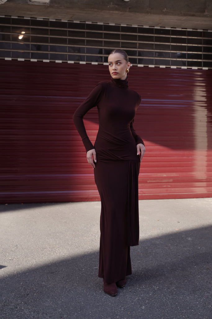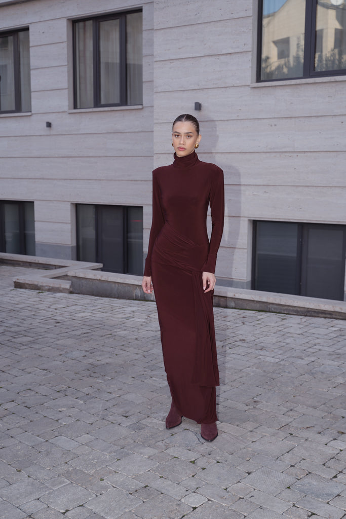 Refined, sculptural, and effortlessly elegant — our Chocolate Draped Turtleneck Maxi Dress is a striking expression of modern minimalism.