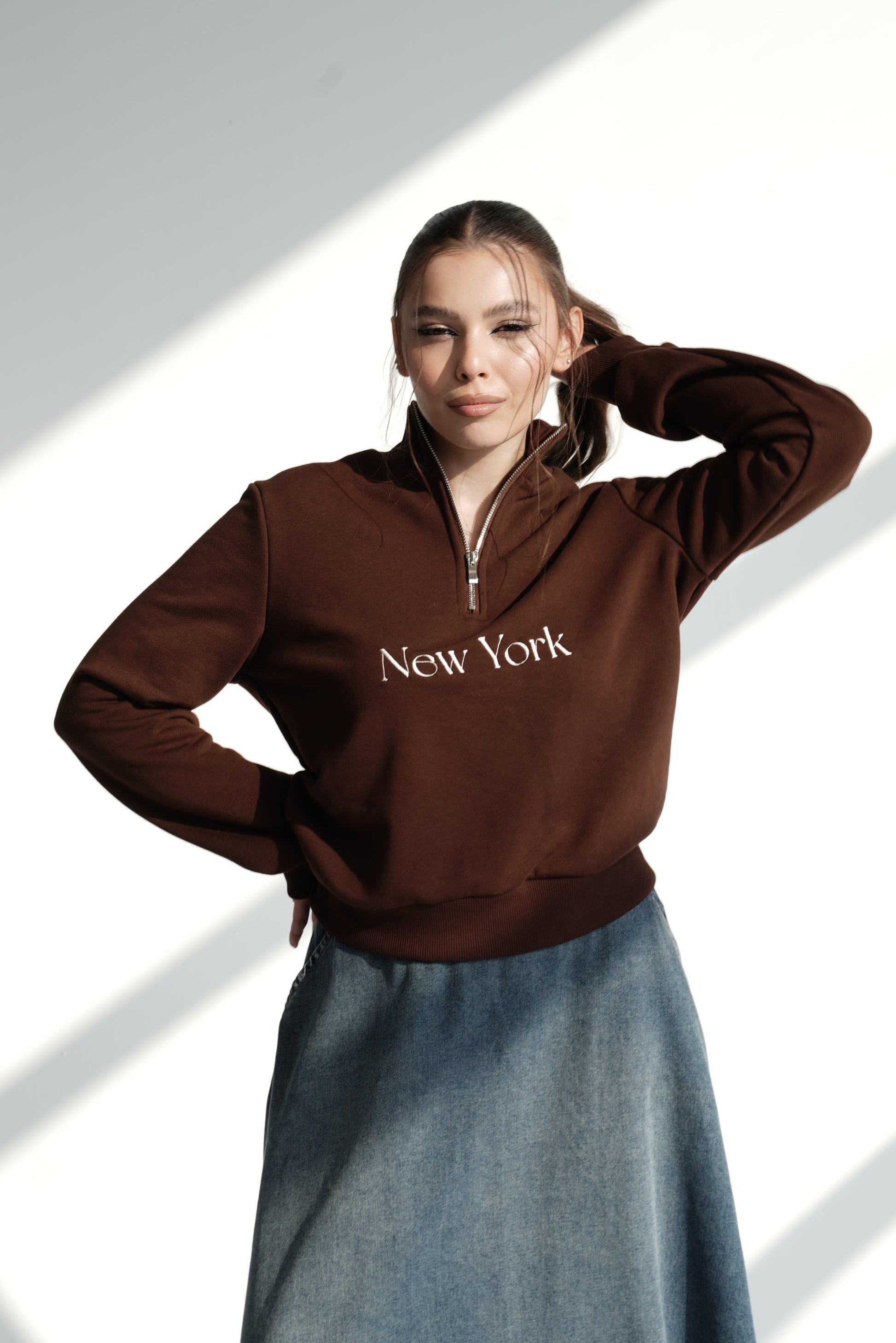 Featuring a soft, cozy fabric and a high collar with a metal half-zip, this piece blends practicality with elevated streetwear aesthetics. The embroidered New York detail adds a subtle statement, making it perfect for casual looks, travel outfits, brunch days, or layering season.