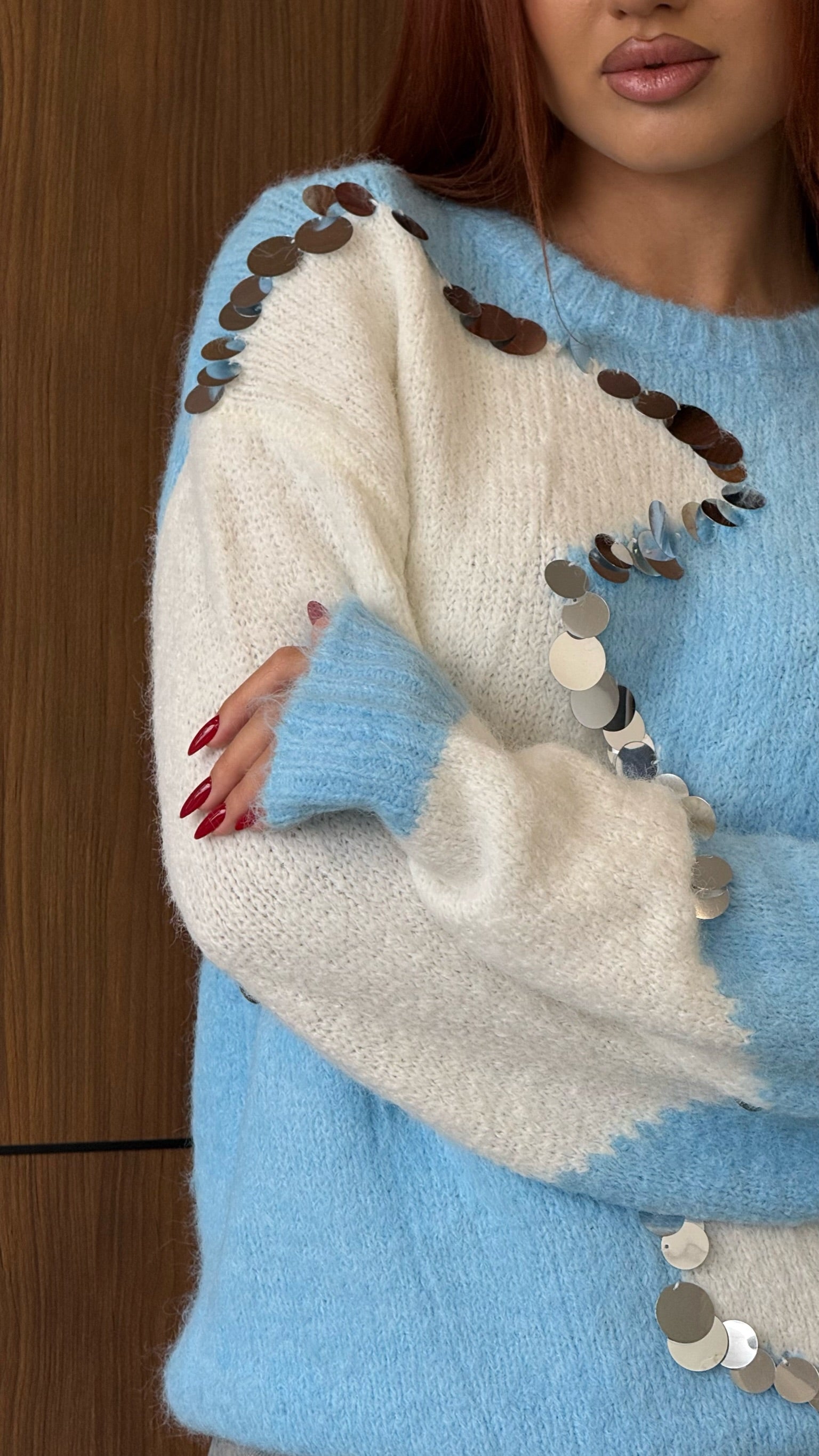 sky blue & White Contrast Knit with Mirror Sequins