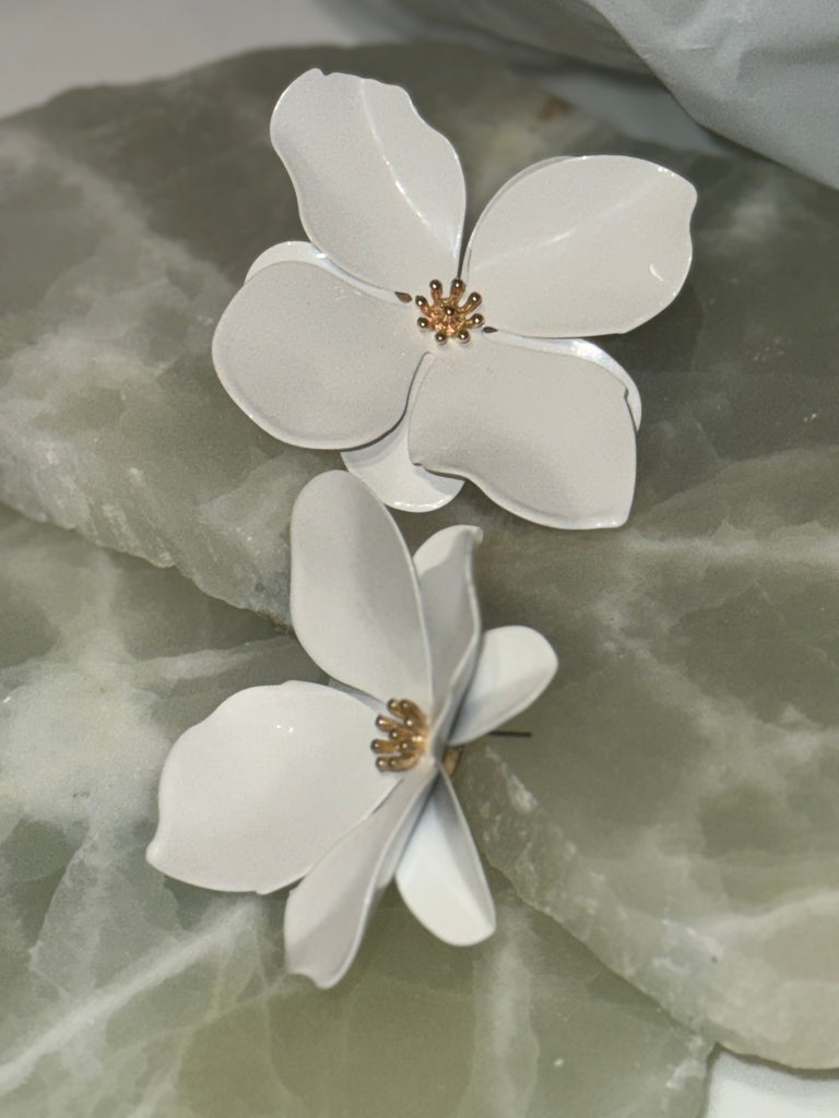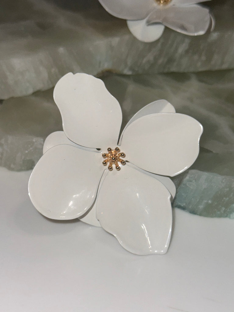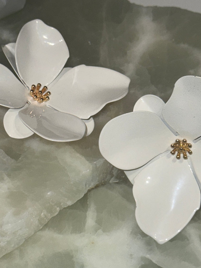 Soft, feminine, and unmistakably elegant — our White Bloom Statement Earrings bring a touch of modern romance to any look. Each oversized petal is crafted with smooth enamel-like detailing and finished with a golden center, giving the flower a sculptural, high-fashion feel.