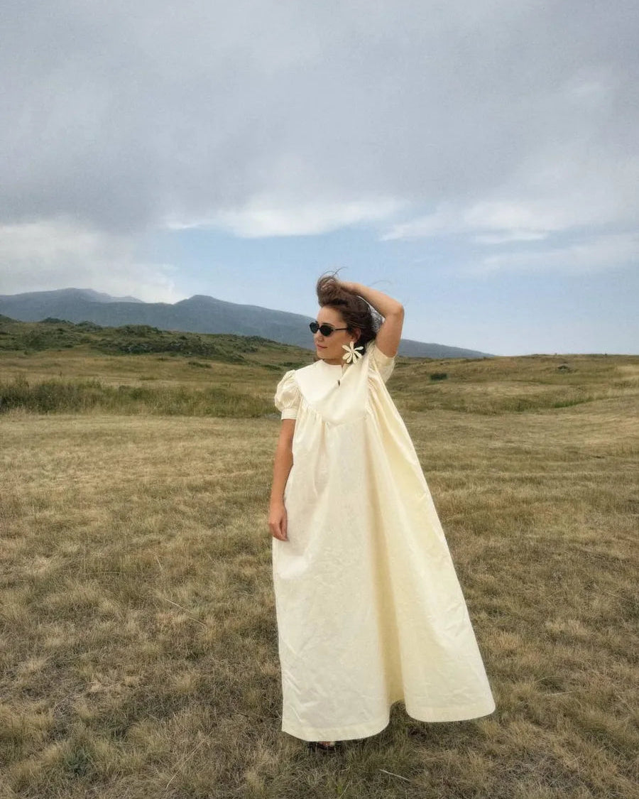 Designed in a warm creamy-vanilla shade, this full-length dress features softly structured puff sleeves and a relaxed flowing silhouette that moves beautifully with every step. The gathered detailing under the bust creates subtle shape while maintaining a comfortable, airy fit.