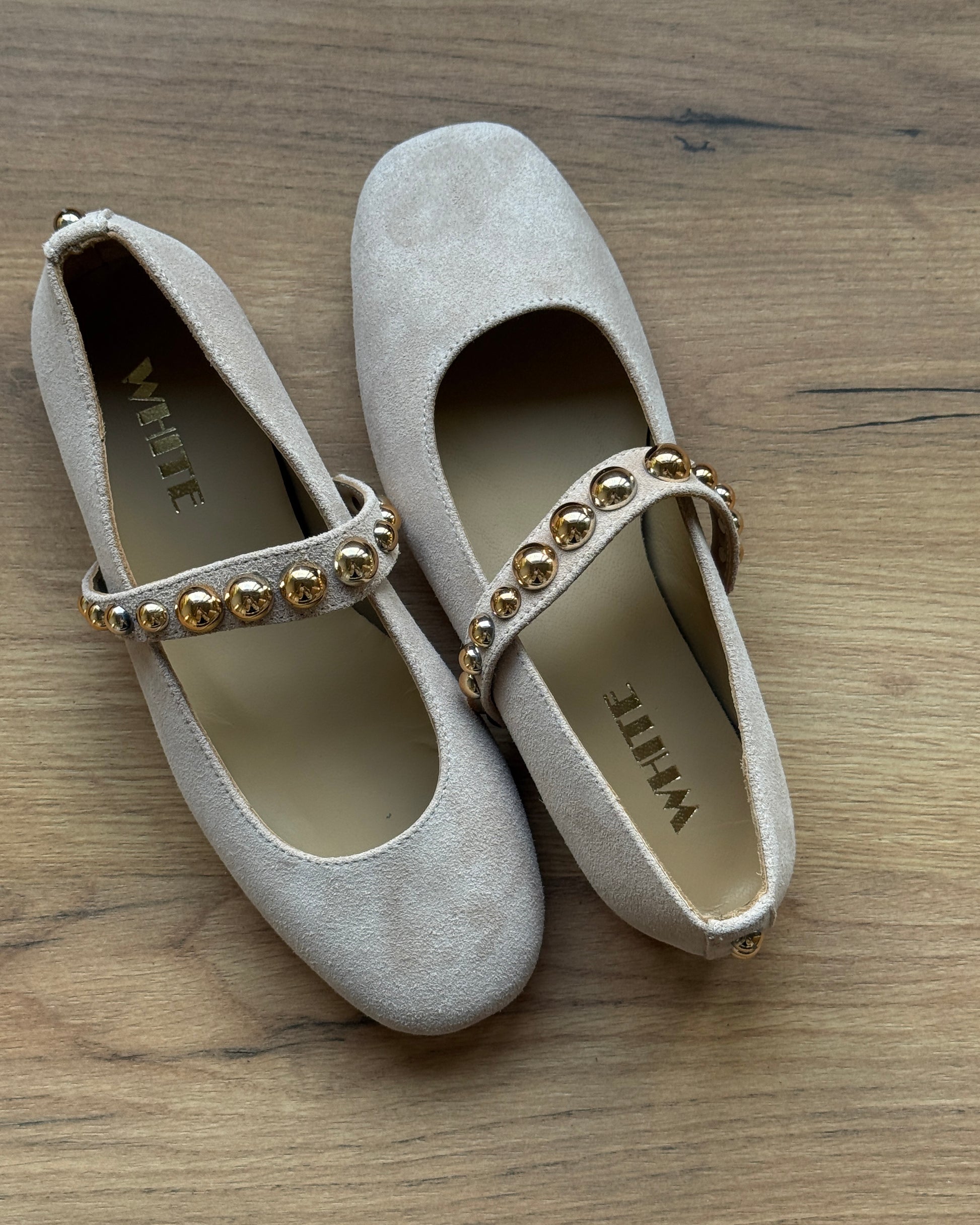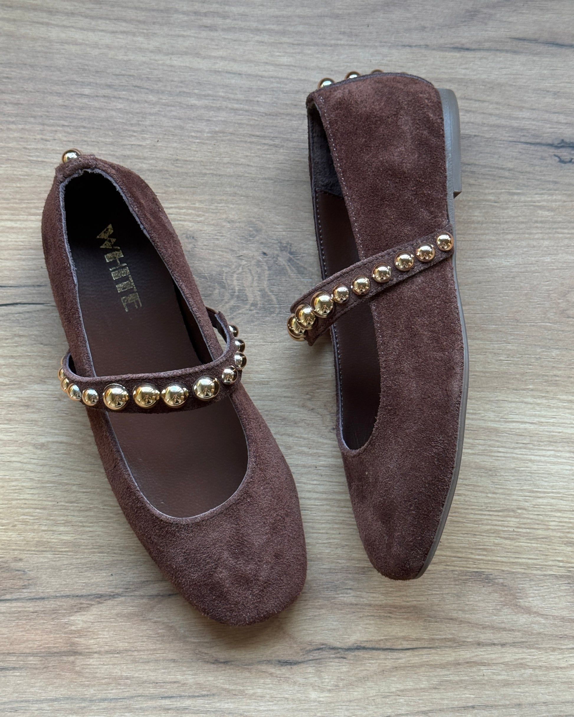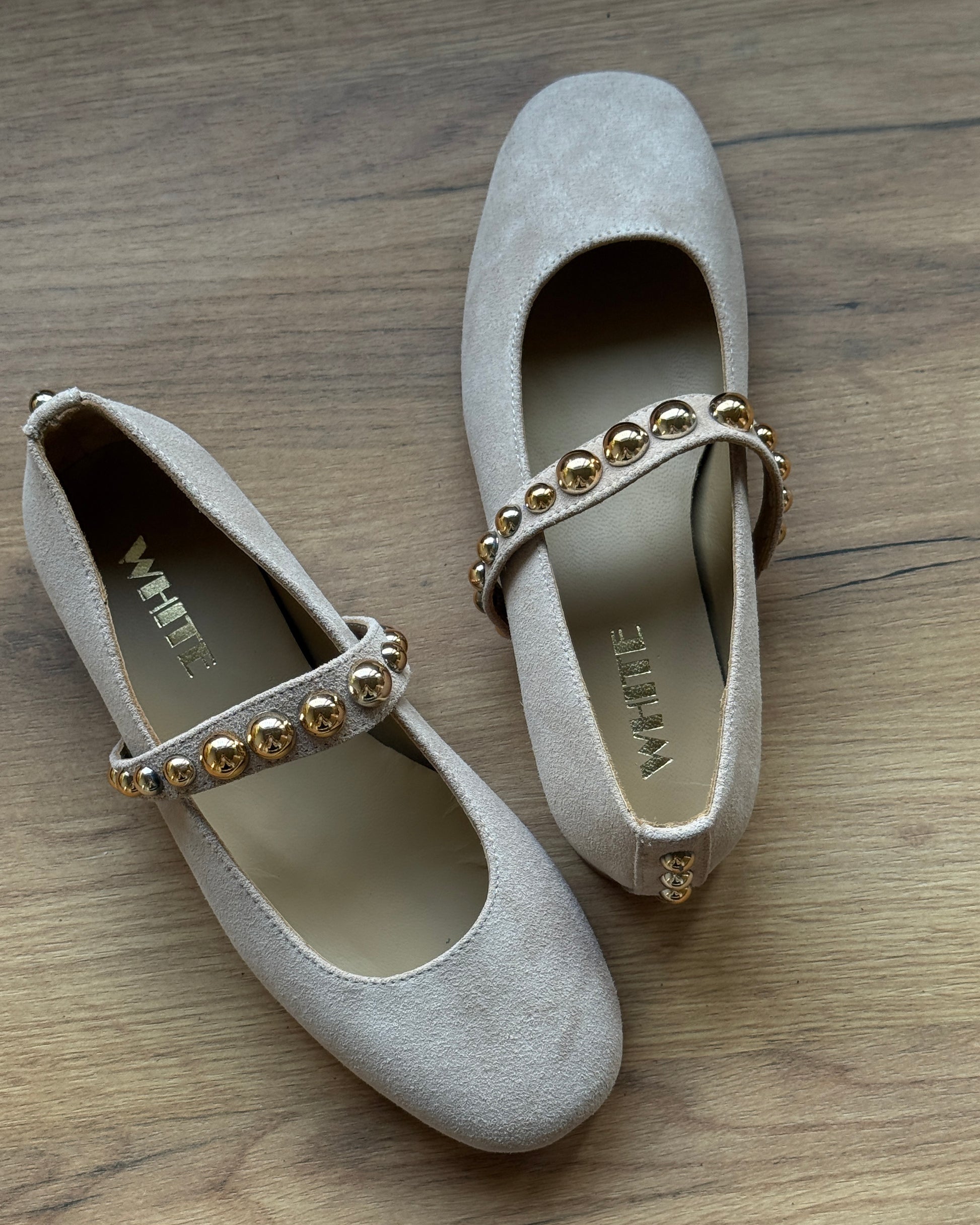 These Suede Studded Ballet Flats are crafted from genuine suede leather, combining timeless femininity with modern statement detailing. The soft suede texture gives a refined, luxurious feel, while the gold-tone studded strap adds character and sophistication.