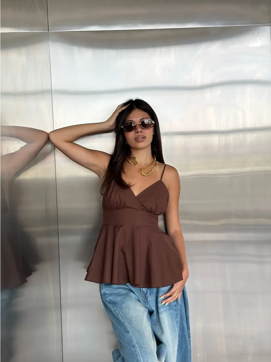 Designed with delicate spaghetti straps and a soft gathered bust, this top beautifully enhances the neckline while the structured high waist creates a flattering silhouette. The flared peplum hem adds movement and shape, giving you that subtle romantic touch.