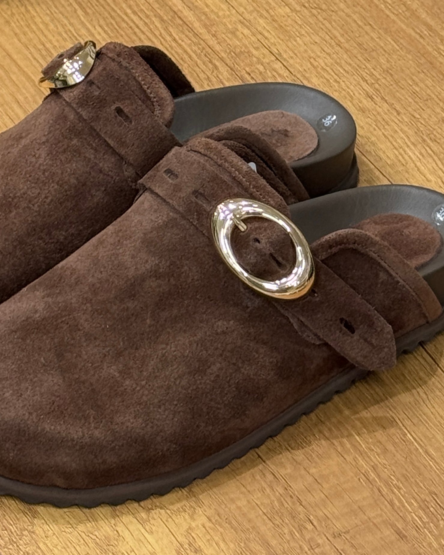Crafted in rich chocolate suede, the Terra Clogs redefine everyday comfort with quiet authority. The soft, structured upper wraps the foot effortlessly, while the oversized gold buckle adds a bold, sculptural accent that feels deliberate, not decorative.